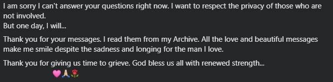 "All the love and beautiful messages make me smile despite the sadness and longing for the man I love. Thank you for giving us time to grieve. God bless us all with renewed strength..."