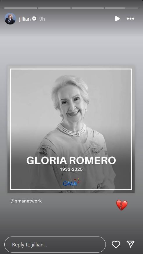 Amy and Richard are just some of Gloria Romero's co-stars remembering her after her passing. In an Instagram Story, the Star of the New Gen Jillian Ward uploaded an image of Gloria Romero along with a broken heart emoji. Jillian and Gloria Romero previously worked together in Daig Kayo Ng Lola Ko. Jillian has also previously shared that Gloria Romero was her “ultimate idol”.