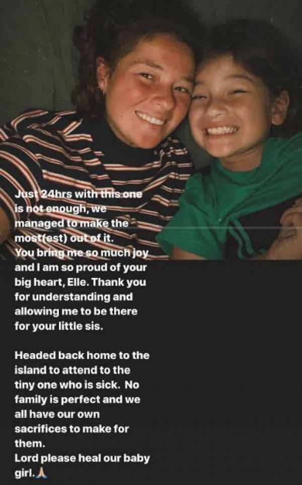 "Headed back home to the island to attend to the tiny one who is sick. No family is perfect and we all have our own sacrifices to make for them. Lord please heal our baby girl.
