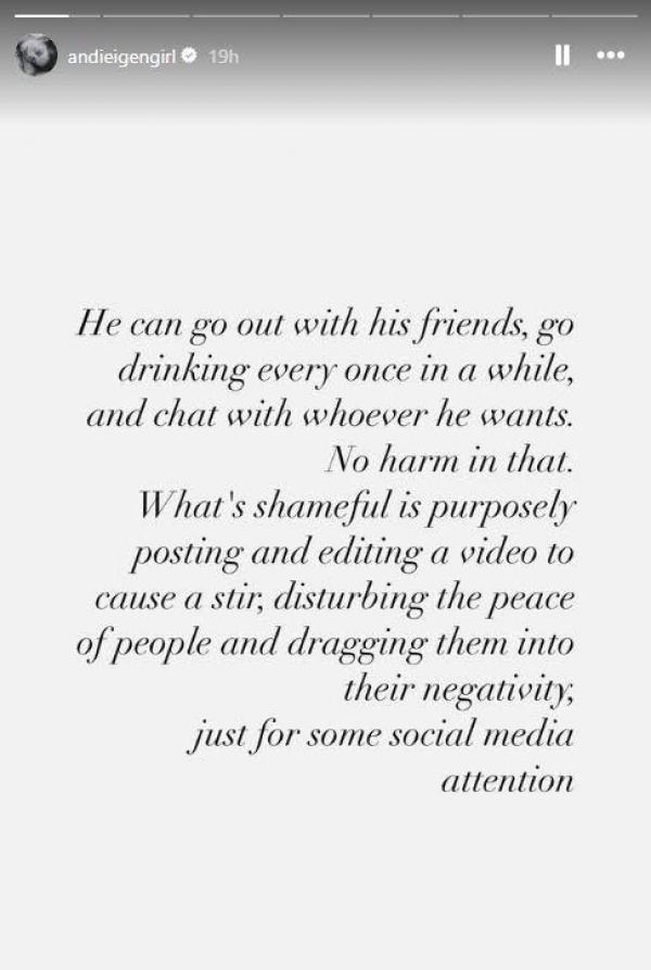 On Instagram stories, the actress-content creator wrote, “He can go out with his friends, go drinking every once in a while, and chat with whoever he wants. No harm in that."