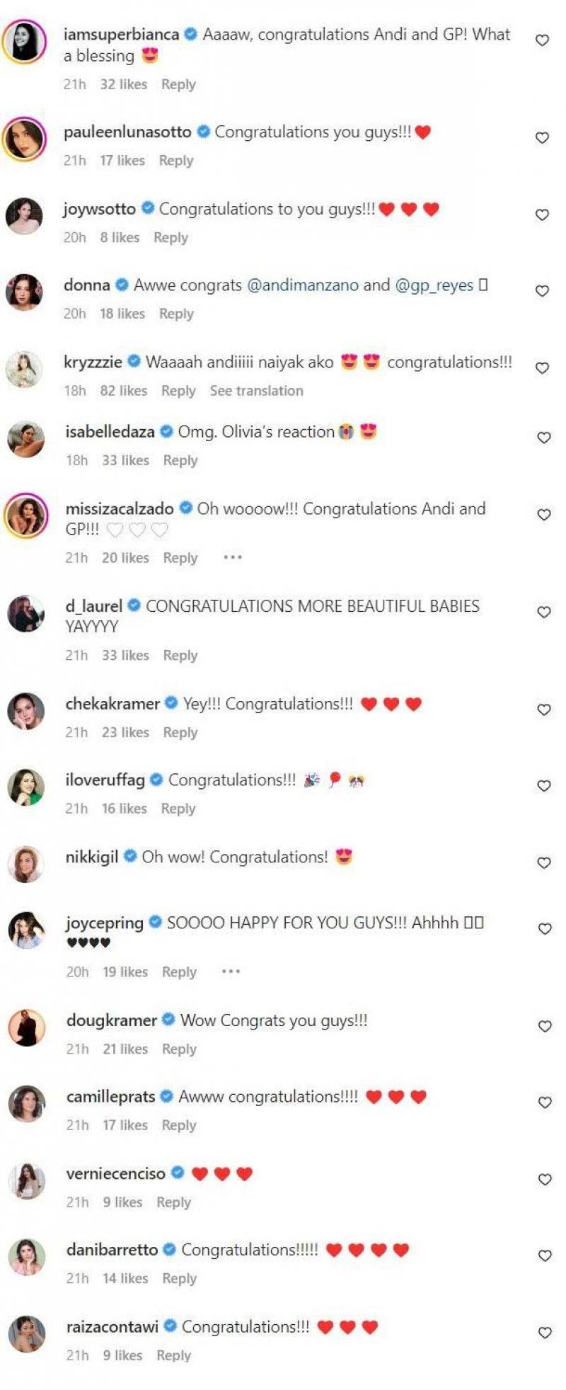 The Reyes couple received a deluge of congratulatory messages from several showbiz personalities including Eat Bulaga host Pauleen Luna, host Joyce Pring, and Sparkle actress Camille Prats.