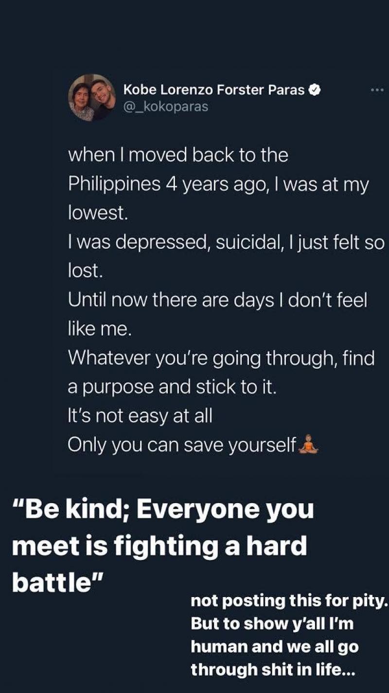 Kobe wrote back then, “When I moved back to the Philippines [four] years ago, I was at my lowest. I was depressed, suicidal. I just felt so lost. Until now, there are days I don't feel like me.