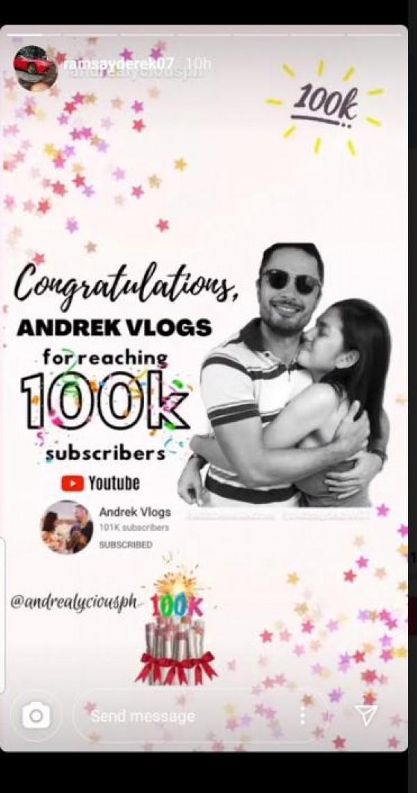 On his Instagram Story, Derek happily announced that their Andrek Vlogs has over 100,000 subscribers already.