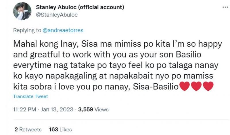 Nag-iwan naman ng mensahe para kay Andrea si Stanley Abuloc, ang batang aktor na gumanap bilang kaniyang anak na si Basilio.