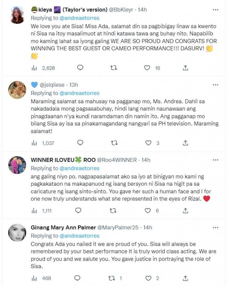 “Maraming salamat sa mahusay na pagganap mo, Ms. Andrea. Dahil sa nakadadala mong pagsasabuhay, hindi lang namin naunawaan ang pinagdaanan n'ya kundi naramdaman din namin ito. Ang pagganap mo bilang Sisa ay isa sa pinakamagandang nangyari sa PH television. Maraming salamat!” komento ni @jslqliese.
