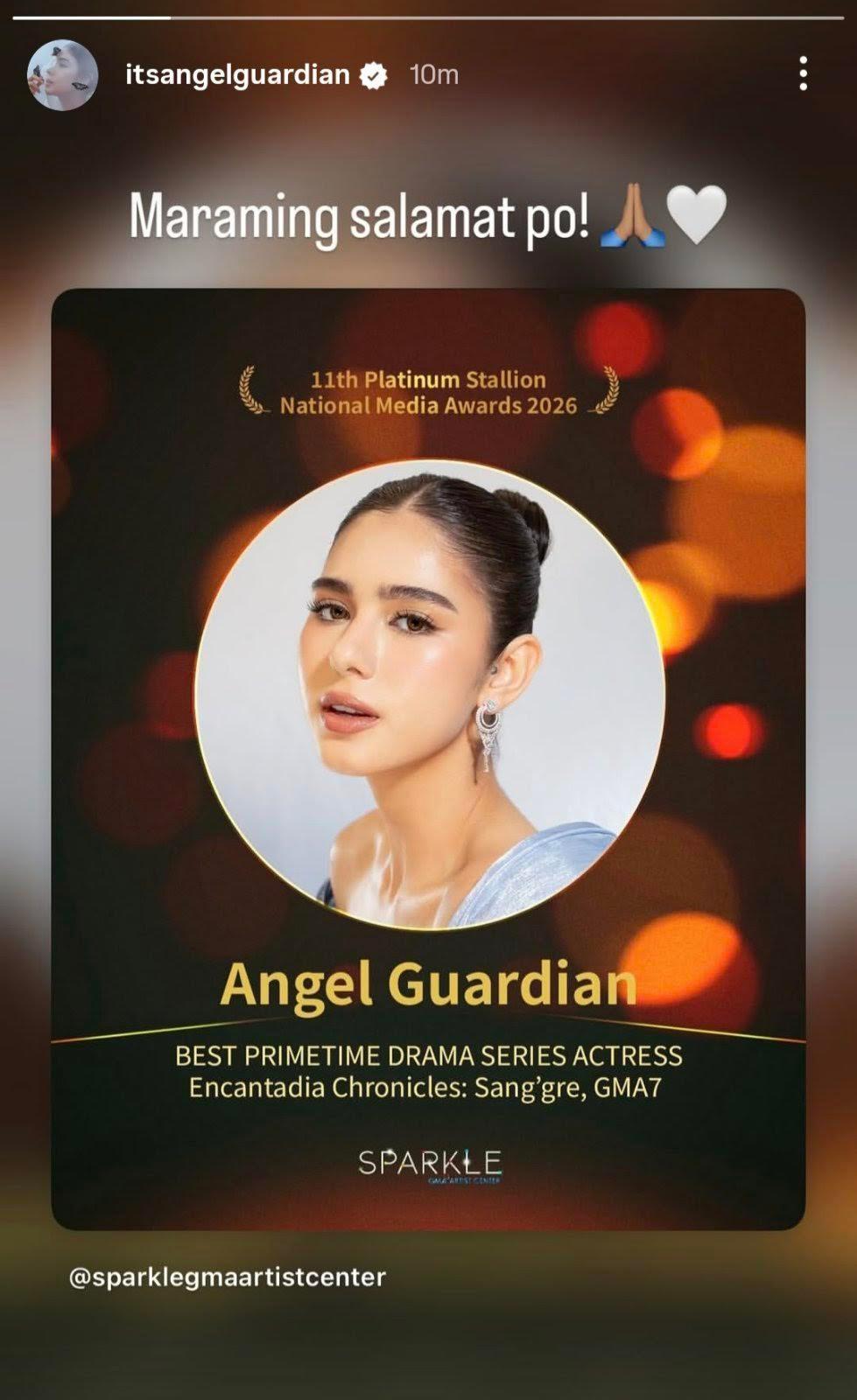 Sa kanyang Instagram story, ibinahagi ng aktres ang pagkilalang natanggap. Sulat niya, "Maraming salamat po!"