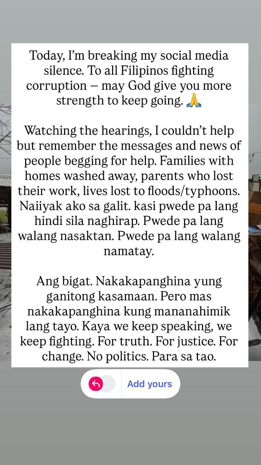 "Today I'm breaking my social media silence. To all Filipinos fighting corruption - may God give you more strength to keep going," panimula niya sa kanyang Instagram Story kahapon.