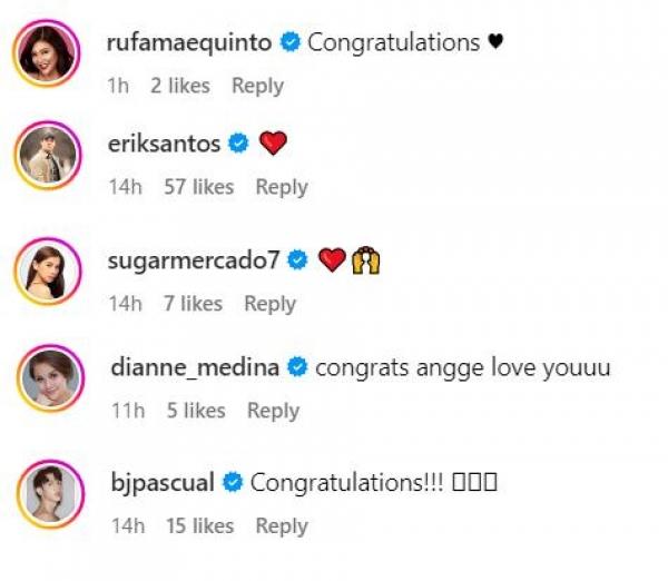 Several celebrities showered Angeline's post with positive reactions including Sparkle comedienne Rufa Mae Quinto and Erik Santos.