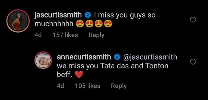The World Between Us star Jasmine Curtis-Smith replied to her sister's post saying that she misses them so much and the TV host-entrepreneur answered back, “@jascurtissmith we miss you Tata das and Tonton beff.”