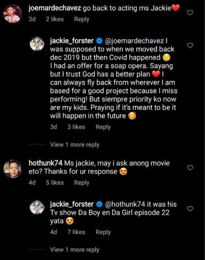 Pagpapatuloy ni Jackie na naniniwala siya na may ibang plano ang Poong Maykapal sa kanya at handa naman daw siya bumalik sa Pilipinas for the right project.