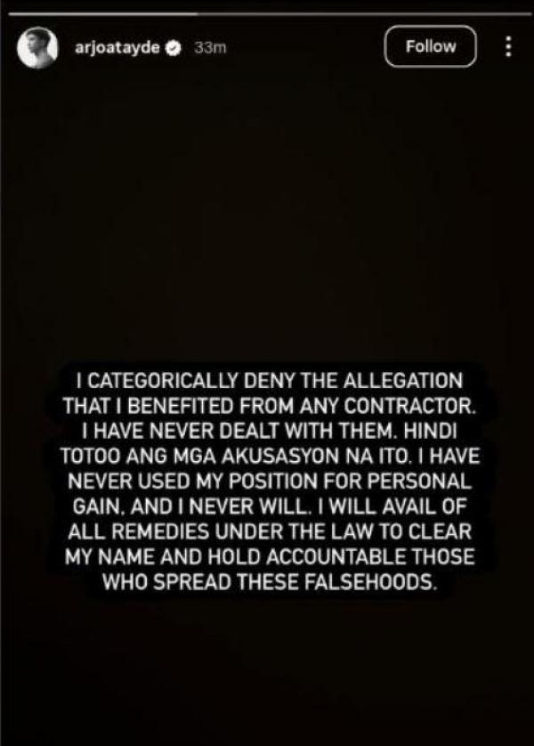 "I CATEGORICALLY DENY THE ALLEGATION THAT I BENEFITED FROM ANY CONTRACTOR. I HAVE NEVER DEALT WITH THEM. HINDI TOTOO ANG MGA AKUSASYON NA ITO. I HAVE NEVER USED MY POSITION FOR PERSONAL GAIN. AND I NEVER WILL. I WILL AVAIL OF ALL REMEDIES UNDER THE LAW TO CLEAR MY NAME AND HOLD ACCOUNTABLE THOSE WHO SPREAD THESE FALSEHOODS."