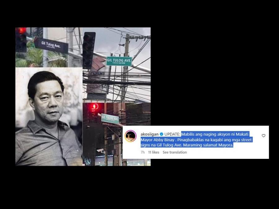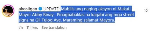 Sabi ng multi-awarded Unang Hirit host sa post nito sa Instagram, “Mabilis ang naging aksyon ni Makati Mayor Abby Binay. Pinagbabaklas na kagabi ang mga street signs na Gil Tulog Ave. Maraming salamat Mayora.”