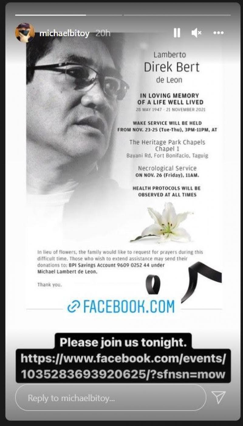 Ibinahagi naman ni Bitoy sa kanyang Instagram account ang ilang detalye sa necrological service ni Direk Bert na idadaos ngayong araw.