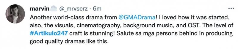 "Another world-class drama from @GMADrama! I loved how it was started, also, the visuals, cinematography, background music, and OST. The level of #Artikulo247 craft is stunning! Salute sa mga persons behind in producing good quality dramas like this," saad ng isang netizen.