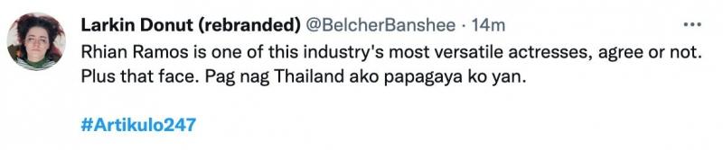 "Rhian Ramos is one of this industry's most versatile actresses, agree or not. Plus that face. Pag nag Thailand ako papagaya ko 'yan," post ng isang netizen.