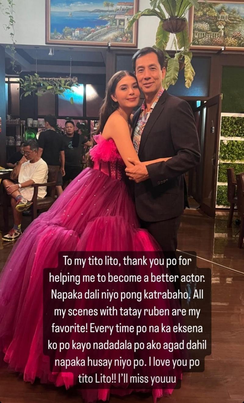 Ikinuwento naman ni Ashley ang karanasan na makatrabaho ang seasoned actor. Sabi niya, "To my Tito Lito, thank you po for helping me to become a better actor. Napakadali niyo pong katrabaho. All my scenes with Tatay Ruben are my favorite! Everytime po na kaeksena ko po kayo nadadala po ako agad dahil napakahusay niyo po. I love you po Tito Lito. I'll miss you."
