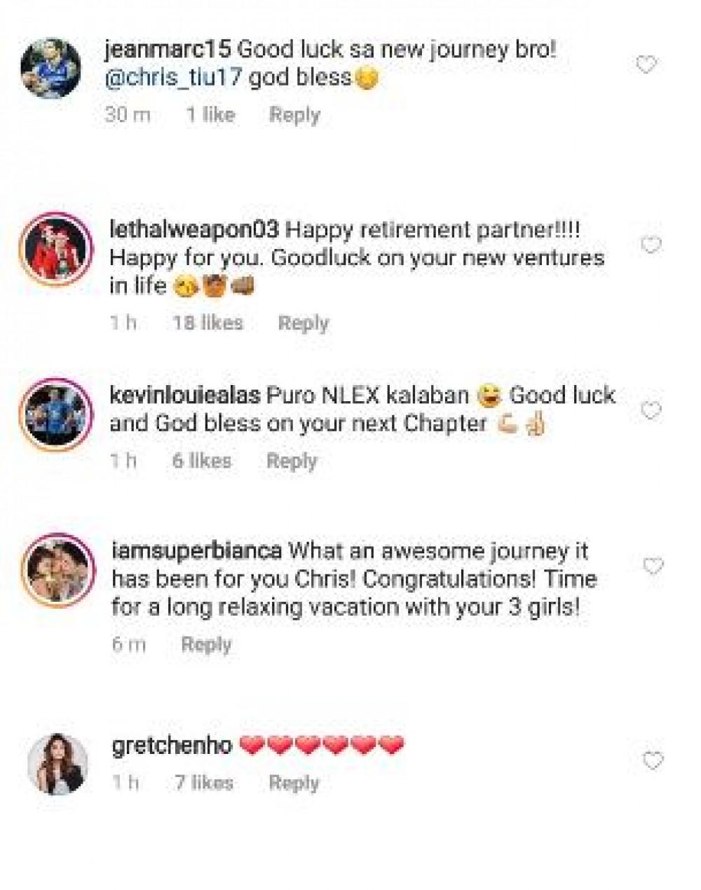 Nag-react din sa retirement ng superstar athlete ang mga celebrity na sina Bianca Gonzalez at Gretchen Ho na tulad ni Chris ay graduate ng Ateneo de Manila University.