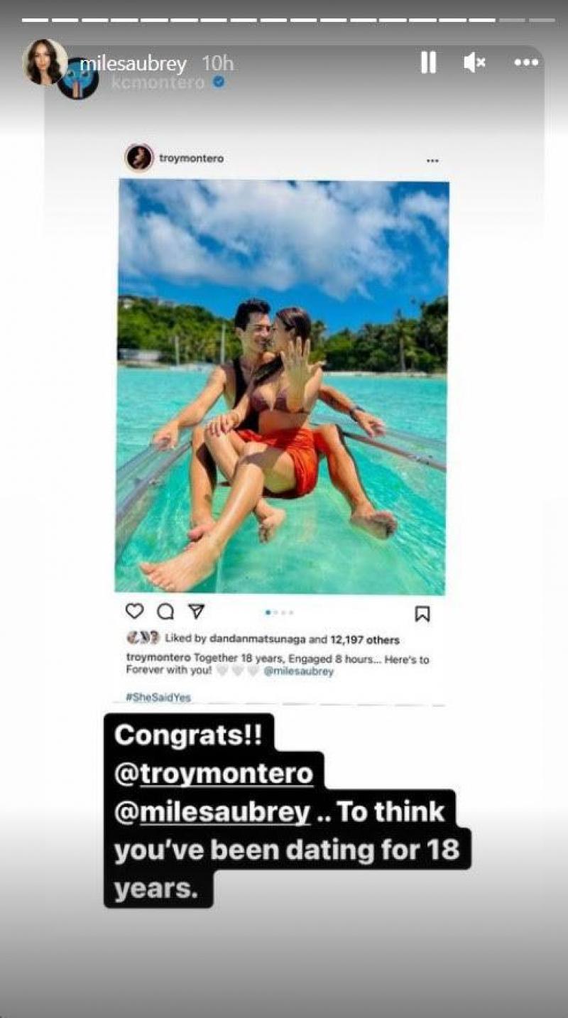 One of the first ones to greet the newly-engaged couple is Troy's brother KC who said, “Congrats @troymontero @milesaubrey.. To think you've been dating for 18 years.”