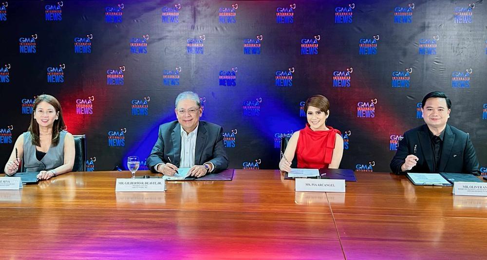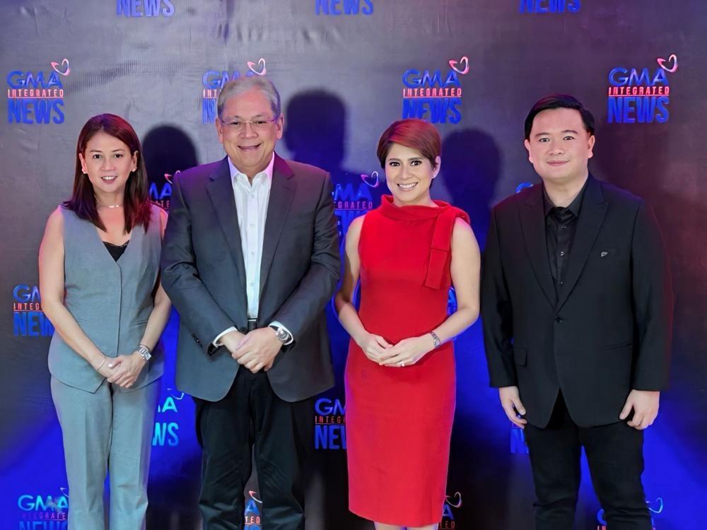 (L-R) GMA Integrated News Vice President and Deputy Head for News Programs and Specials Michelle Seva, GMA Network President and CEO Gilberto R. Duavit, Jr., Pia Arcangel, and Senior Vice President and Head of GMA Integrated News, Regional TV, and Synergy Oliver Victor B. Amoroso.
