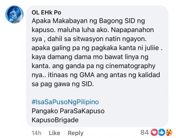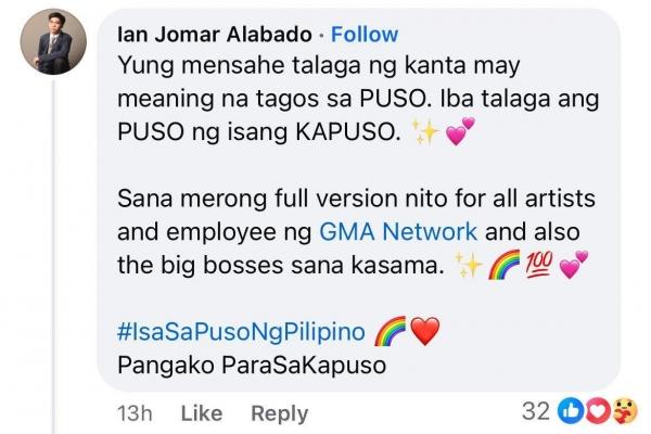 “'Yung mensahe talaga ng kanta may meaning na tagos sa PUSO. Iba talaga ang PUSO ng isang KAPUSO,” komento naman ng isang netizen.