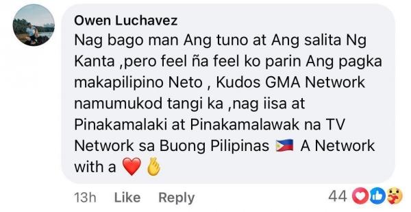 “Nagbago man ang tono at ang salita ng kanta, pero feel na feel ko pa rin ang pagka-maka-Pilipino nito, Kudos GMA Network namumukod tangi ka, nag-iisa at pinakamalaki at pinakamalawak na TV Network sa buong Pilipinas. A network with a [heart],” dadag pa ng isang Kapuso fan.