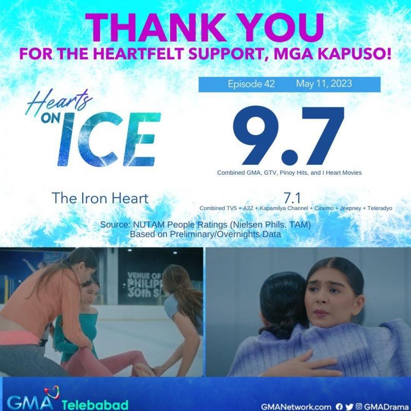 Noong Huwebes, nakapagtala ng 9.7 percent na ratings ang 42nd episode ng Hearts On Ice base sa NUTAM People Ratings ng pinagkakatiwalaang market research firm na Nielsen Philippines.