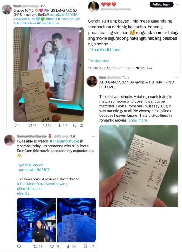 Ilang netizens din ang nagpo-post ng kanilang opinyon at pahayag kung gaano sila kinilig sa dalawang bida ng pelikula. Isang netizen pa ang nag-rate sa That Kind of Love ng 10/10, at sinabing kinilig lang siya ng dalawang oras.