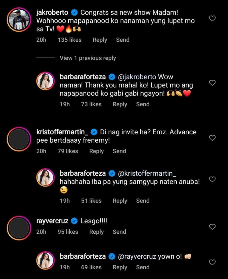 In the comment section, Barbie received birthday greetings and congratulatory messages from friends and fans, including her boyfriend Jak, who wrote, "Congrats sa new show Madam! Wohhooo mapapanood ko nanaman yung lupet mo sa [TV]!”