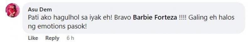 "Pati ako hagulgol sa iyak e! Bravo Barbie Forteza !!!! Galing e, halos lahat ng emotions pasok!," ani ng isang viewer.