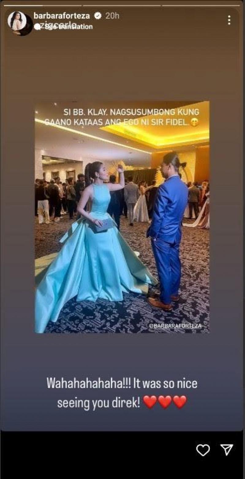 Sa Instagram Story ni Direk Zig, may hirit siya sa nakunan photo nila ni Barbie. Sabi niya sa caption, “Si BB Klay, nagsusumbong kung gaano kataas ang ego ni Sir Fidel.”