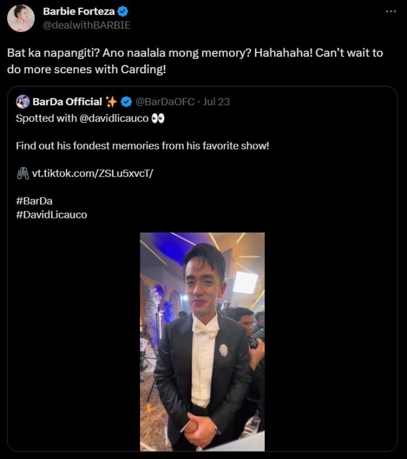 “Bat ka napangiti? Ano naalala mong memory? Hahahaha! Can't wait to do more scenes with Carding!” komento nito sa video interview.