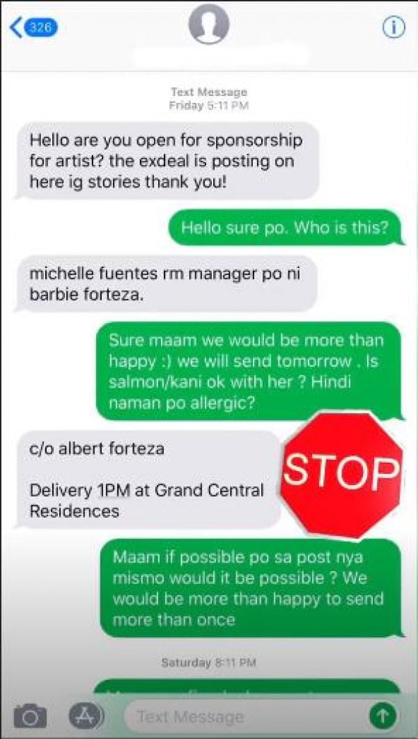 In her first post, Barbie shared a text conversation that happened between an online seller and someone who is pretending to be Barbie's road manager named "Michelle Fuentes."
