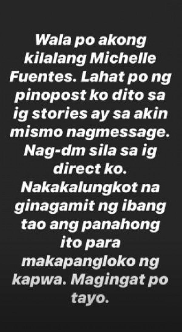 "Wala po akong kilalang Michelle Fuentes. Lahat po ng pino-post ko dito sa IG Stories ay sa akin mismo nag-message. Nag-DM sila sa IG Direct ko. Nakakalungkot na ginagamit ng ibang tao ang panahong ito para makapangloko ng kapwa. Magingat po tayo," she said.