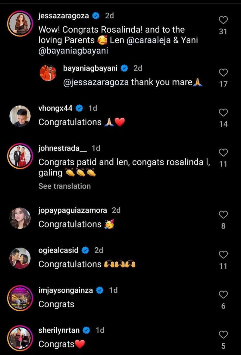 In the comments section, Bayani's daughter received many congratulatory messages from local celebrities such as Jayson Gainza, Sherilyn Reyes-Tan, John Estrada, Ogie Alcasid, Jessa Zaragoza, Vhong Navarro, and Jopay Paguia-Zamora.