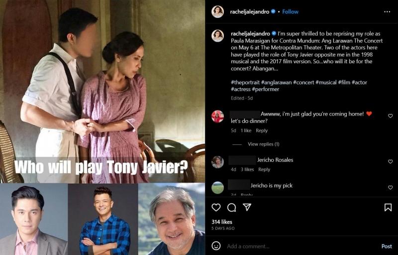“I'm super thrilled to be reprising my role as Paula Marasigan for Contra Mundum: Ang Larawan The Concert on May 6 at The Metropolitan Theater. Two of the actors here have played the role of Tony Javier opposite me in the 1998 musical and the 2017 film version. So…who will it be for the concert? …” she captioned her post.