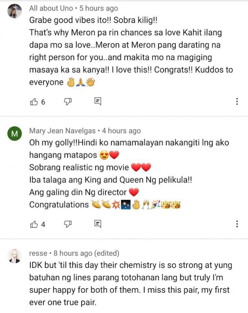 Ayon naman kay Mac0791, "I missed them grabe. Parang true to life ang mga reactions at linya. Love the unspoken words in one scene, their actions say it all. Galing, kinilig na naman ako."