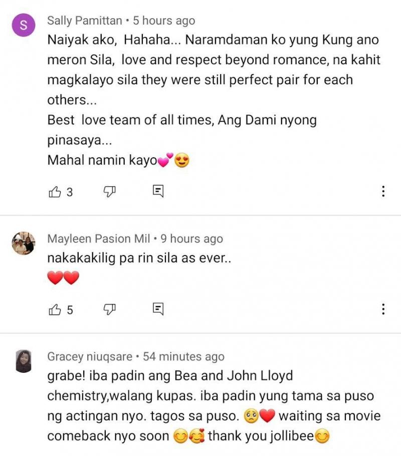 "Iba pa rin ang Bea and John Lloyd chemistry, walang kupas. Iba pa rin 'yung tama sa puso ng [aktingan] n'yo, tagos sa puso. Waiting sa movie comeback n'yo soon," paghanga ni Gracey Niuqsare.