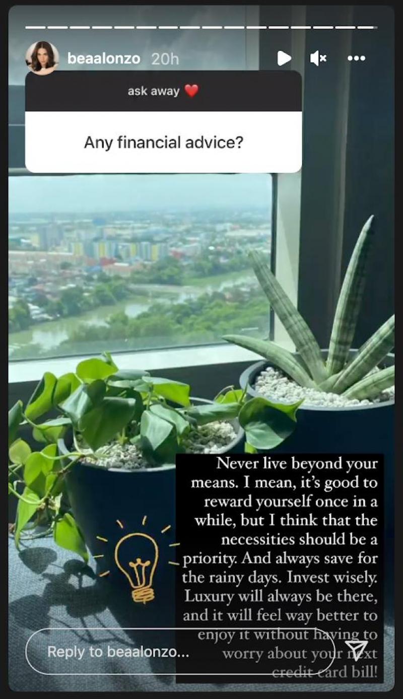 "Never live beyond your means. I mean, it's good to reward yourself once in a while, but I think that the necessities should be a priority. And always save for the rainy days. Invest wisely," ani Bea.
