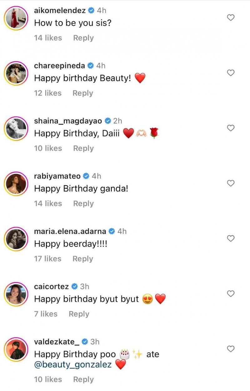 In the comments section of her post, several celebrities sent their birthday greetings for Beauty including Kapuso stars Carla Abellana, Rabiya Mateo, Ashley Rivera, Ellen Adarna, Aiko Melendez, Althea Ablan, and her co-stars in the Walang Matigas Na Pulis sa Matinik Na Misis remake Max Collins and Kate Valdez.