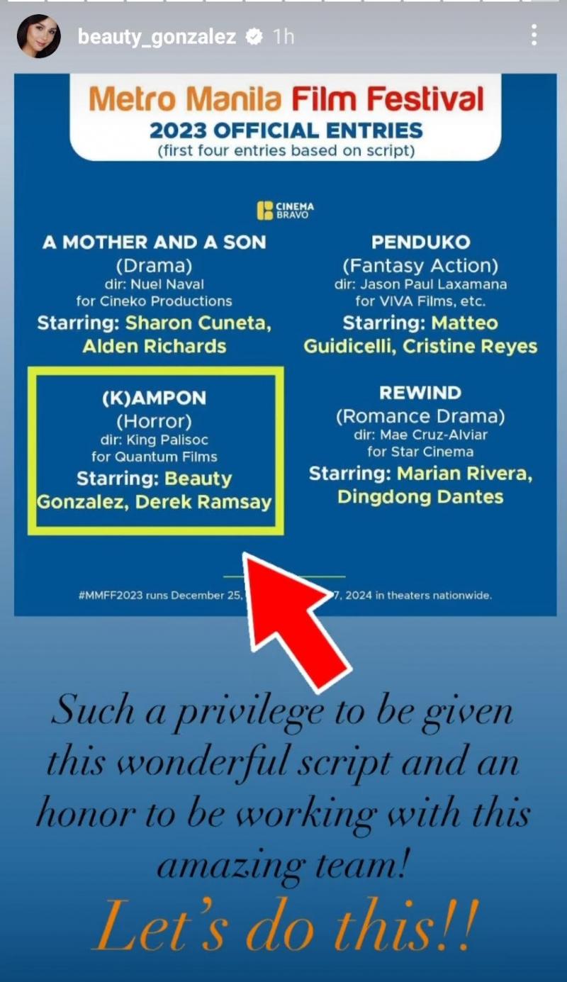 Sa Instagram story post ni Beauty, ibinahagi niya ang larawan ng unang apat na entries na kabilang sa MMFF at sinabing isang karangalan ang makatrabaho ang team sa likod ng kanyang bagong pelikula.