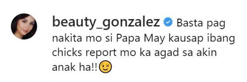 Biniro naman ni Beauty si Raphael na isa itong pang-bribe. "Basta 'pag nakita mo si Papa May kausap ibang chicks report mo ka agad sa akin anak ha," komento ng aktres sa post ng child star na parte rin ng Voltes V: Legacy.