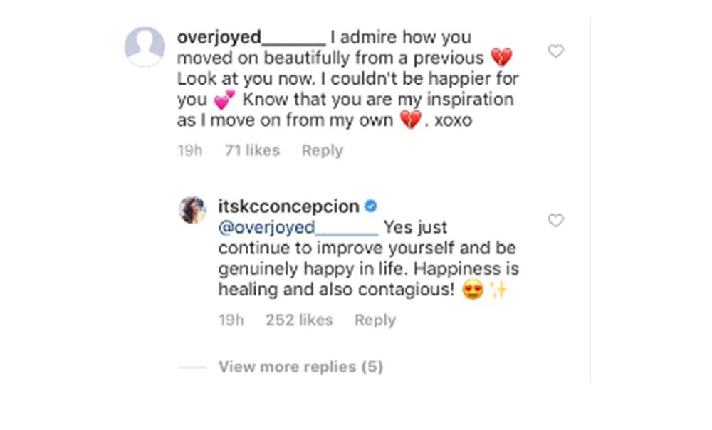 Isa naman netizen na may Instagram handler na @overjoyed ang nag-comment sa Instagram page ni KC at sinabi na humahanga ito kung paano siya naka-move on sa break up nila ng kaniyang ex-boyfriend na si Aly Borromeo.