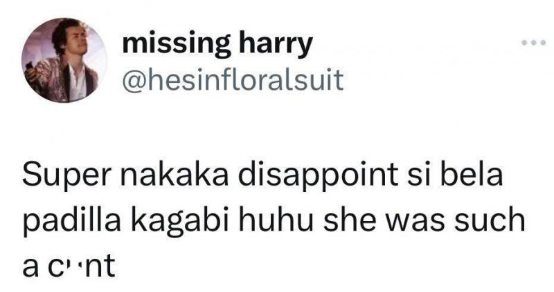 The tweet read, "Super nakaka-disappoint si bela padilla kagabi huhu she was such a c*nt."