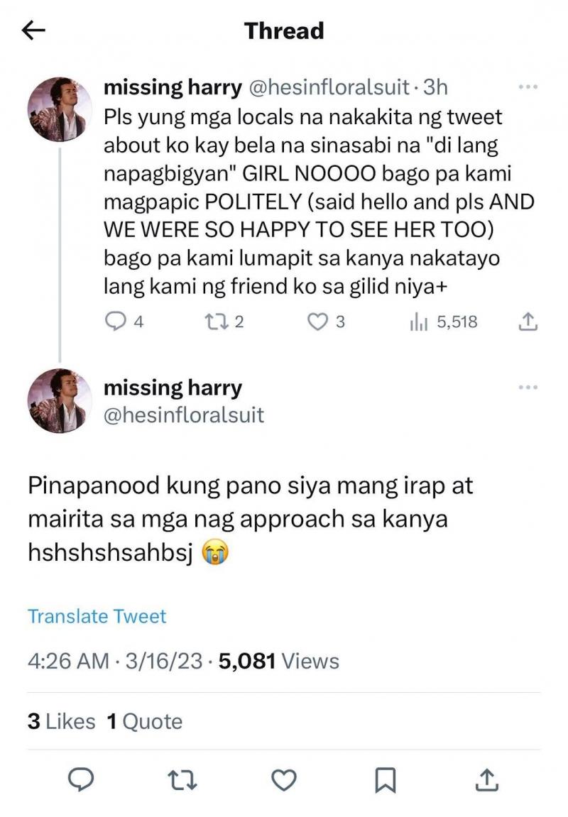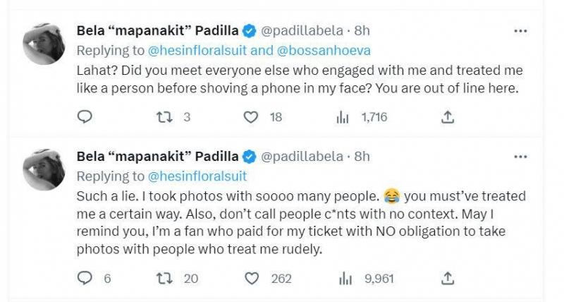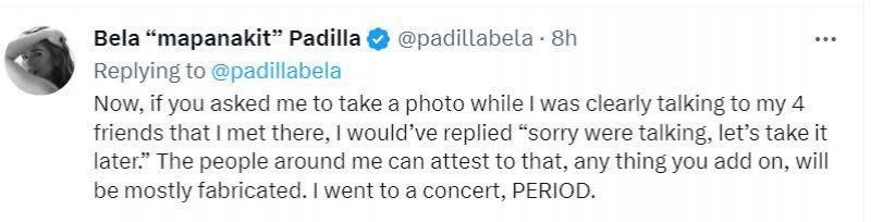 "Pls 'yung mga locals na nakakita ng tweet about ko kay bela na sinasabi na 'di lang napagbigyan' GRL NOOOO bago pa kami magpapic POLITELY (said hello and pls AND WE WERE SO HAPPY TO SEE HER TOO) bago pa kami lumapit sa kanya nakatayo lang kami ng friend ko sa gilid niya, pinapanood kung paano siya magn irap at mairita sa mga nag approach sa kanya."