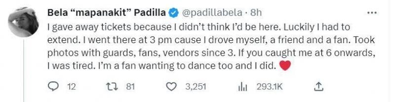 "I gave away tickets because I didn't think I'd be here. Luckily I had to extend. I went there at 3 pm cause I drove myself, a friend and a fan. Took photos with guards, fans, vendors since 3. If you caught me at 6 onwards, I was tired. I'm a fan wanting to dance too and I did."