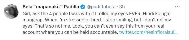 “Girl, ask the 4 people I was with if I rolled my eyes EVER. Hindi ko ugali mangirap. When I'm stressed or tired, I stop smiling, but I don't roll my eyes. That's so not me. Look, you can't even say this from your real account where you can be held accountable.”