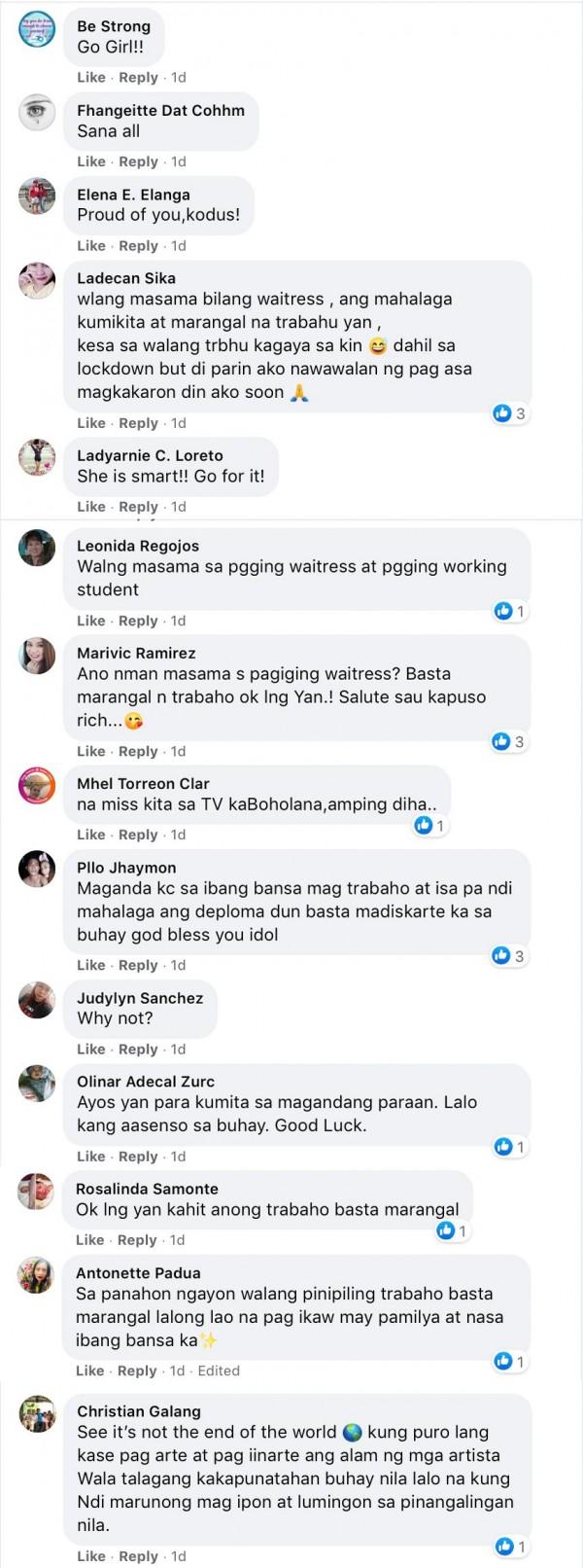 “Dahil di na ko ako nagpaka-choosy, sinubukan ko na ang pagwi-waitress. Casual job at a restaurant. Nu'ng una nahirapan ako tanggapin pero na-realize ko ngayon, ano naman ang masama du'n?