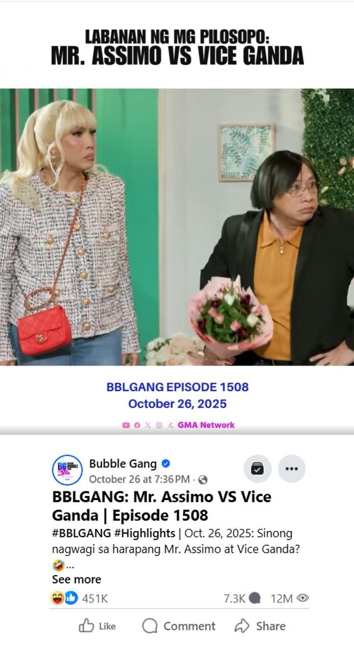 One of the viral sketches in the BG30 concert was the grand collaboration of Michael V., who played Mr. Asssimo, and Unkabogable Star Vice Ganda. As of writing, the viral scene has garnered over 12 million views on Facebook alone.
