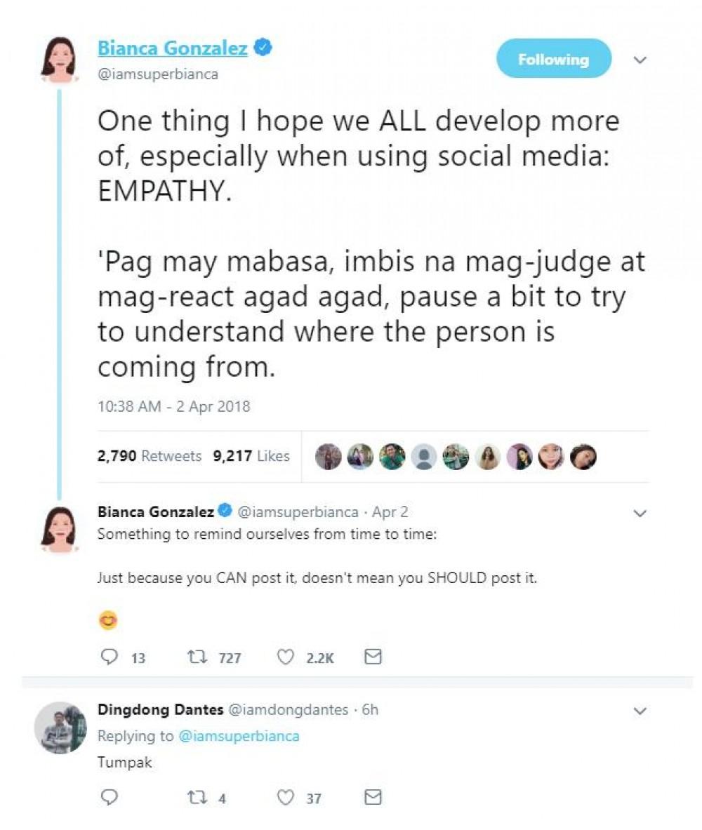 May paalala ang celebrity TV host na si Bianca Gonzalez-Intal sa lahat ng mga tao na gumagamit ng social media.