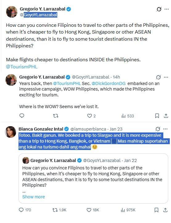 He wrote on X, “How can you convince Filipinos to travel to other parts of the Philippines, when it's cheaper to fly to Hong Kong, Singapore or other ASEAN destinations, than it is to fly to some tourist destinations IN the Philippines?